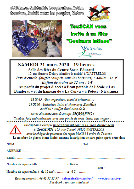 L'association TouSCAN de Wattrelos a le plaisir de vous inviter à sa traditionnelle fête "Couleurs Latines" dont vous trouverez en pièce jointe le flyer.