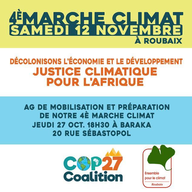 Comme tu le sais, les trajectoires climatique et biodiversité sont catastrophiques, nous devons laisser dans le sol 80% des énergies fossiles, le Nord principal responsable doit financer le Sud premières victimes et derniers responsables ! Rejoins la mobilisation de la coalition COP 27 pour faire pression sur la COP qui se tiendra en Egypte, lors de la journée mondiale de protestation le samedi 12 novembre. Aides nous à organiser à Roubaix, une 4è marche pour le climat, participes à notre AG de mobilisation jeudi 27 oct. à 18h30 à Baraka :