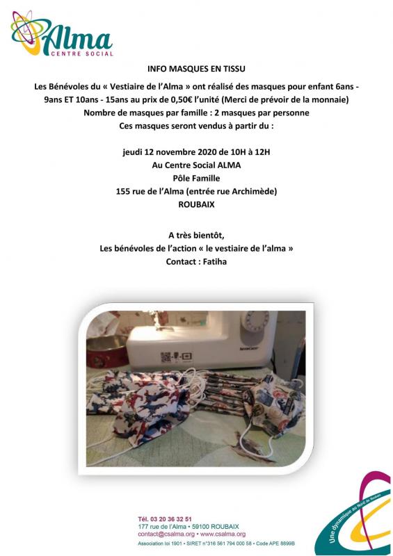 Info masques en tissu, les bénévoles du "vestiaire de l'alma" ont réalisé des masques pour enfants