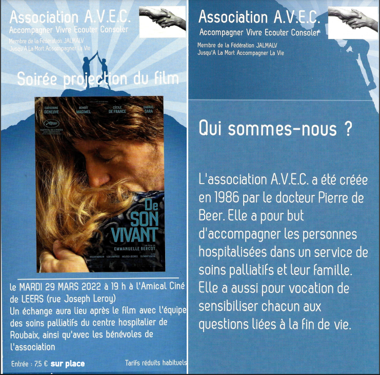 * L'association roubaisienne Accompagner. Vivre. Ecouter. Consoler (A.V.E.C) est membre de la fédération nationale J.A.L.MA.L.V (Jusqu'à la Mort, Accompagner la Vie). Elle a pour vocation de visiter et d'accompagner les personnes hospitalisées dans un service de soins palliatifs. Par son expérience, elle a aussi pour mission de sensibiliser et de partager au grand public ce qui se vit dans un service de soins palliatifs, de répondre aux questions, souvent tabous, autour de la fin de vie.