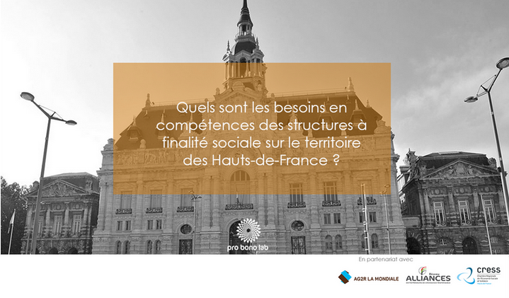 Pro Bono Lab, en partenariat avec AG2R La Mondiale, le Réseau Alliances et la CRESS Hauts-de-France, mène actuellement une étude sur l’engagement des entreprises en faveur du territoire des Hauts-de-France, notamment en matière de soutien à la vie locale et associative. Cette étude permettrait aux associations des Hauts-de-France de valoriser leurs pratiques de coopération actuelles, d'exprimer leurs besoins en accompagnement et en compétences, et d'étudier le potentiel de développement des dispositifs de bénévolat / mécénat de compétences, comme outil de réponse à ces besoins.