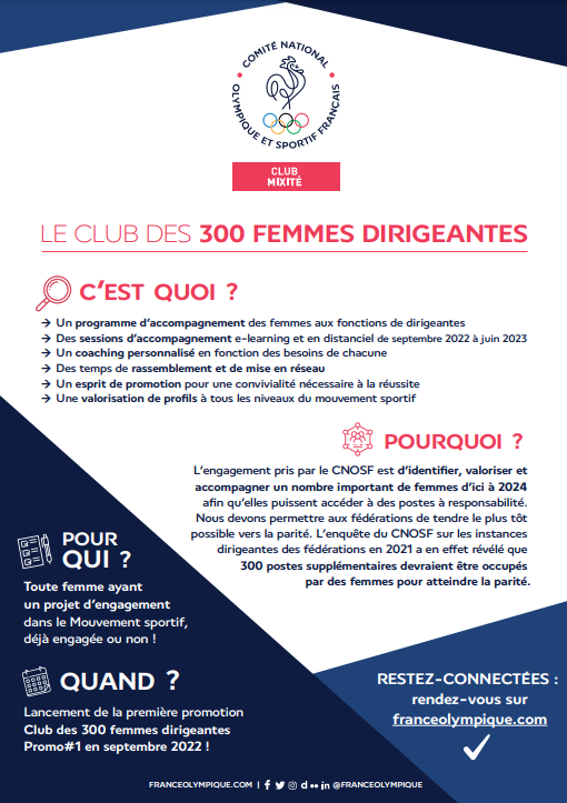 (CNOSF) propose un programme destiné à promouvoir les femmes qui souhaitent accéder aux responsabilités sportives, intitulé le « Club des 300 femmes dirigeantes ». Le Club des 300 femmes dirigeantes du CNOSF est un programme visant à accompagner et valoriser 300 femmes dirigeantes d’ici 2024...