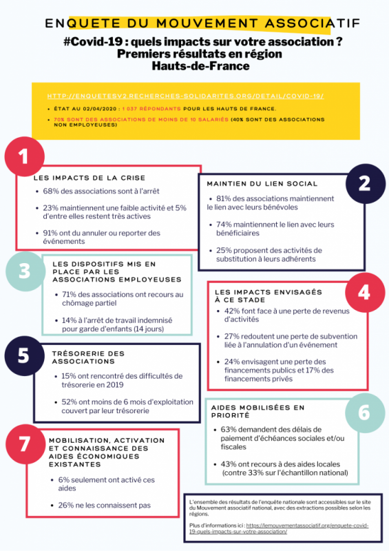 Voici les résultats pour la région Haut de France réalisée du 20 mars au 7 avril 2020 en coopération avec le Mouvement associatif, le Réseau National des Maisons d’Associations (RNMA) et l’appui de Recherches & Solidarités,
