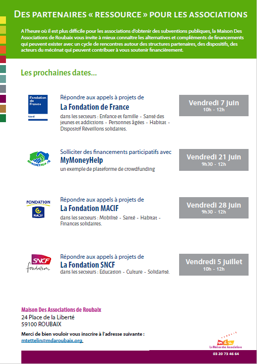 A l’heure où il est plus difficile pour les associations d’obtenir des subventions publiques, la Maison Des Associations de Roubaix vous invite à mieux connaître les alternatives et compléments de financements qui peuvent exister avec un cycle de rencontres autour des structures partenaires, des dispositifs, des acteurs du mécénat qui peuvent contribuer à vous soutenir financièrement.