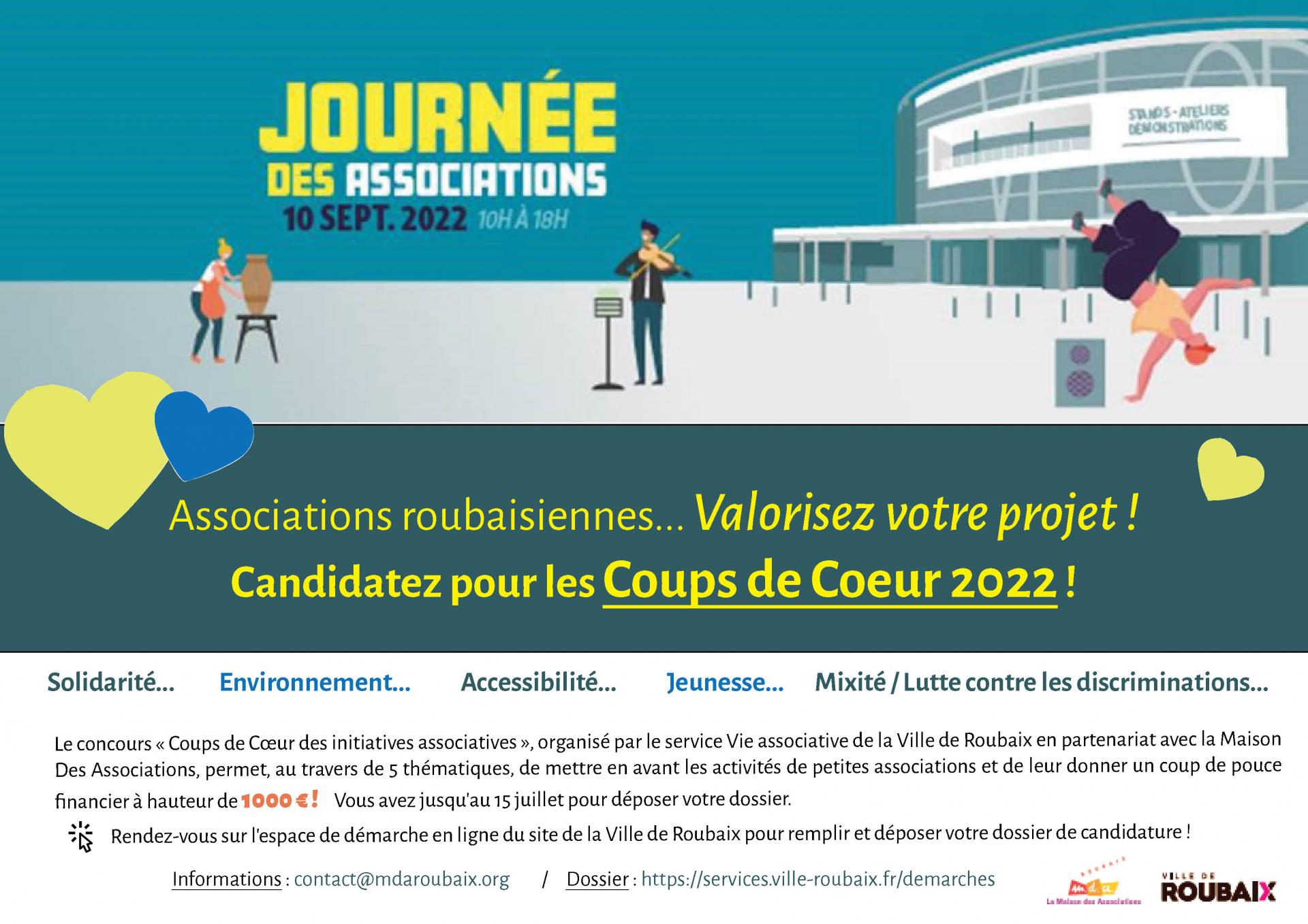 Le concours « Coups de Cœur des initiatives associatives », organisé par le service Vie associative de la Ville de Roubaix en partenariat avec la Maison des Associations, permet de mettre en avant les activités de petites associations et de leur donner un coup de pouce financier à hauteur de 1000 €. Vous êtes membres d’une association roubaisienne qui œuvre tout au long de l’année ? Vous menez une action exemplaire que vous souhaitez mettre en avant ? Vous pouvez candidater !