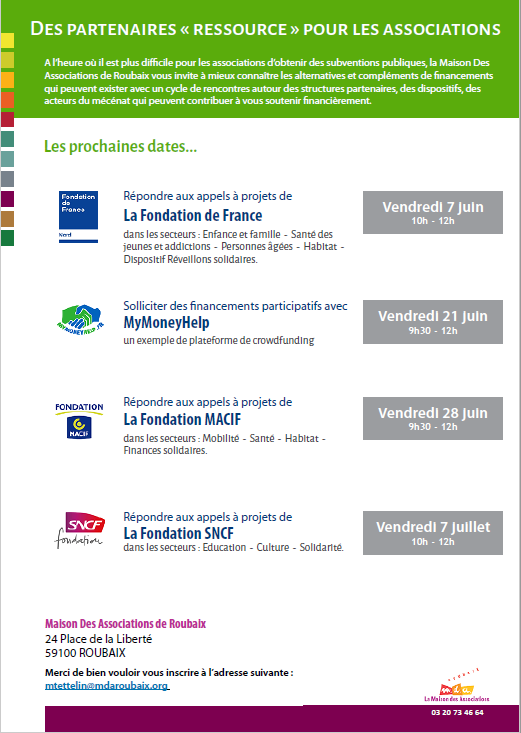 A l'heure où il est plus difficile pour les associations d'obtenir des subventions publiques, il est important de s'intéresser à toutes les alternatives et compléments de financements qui peuvent exister. La MDA vous propose un cycle de rencontres autour des structures partenaires, des dispositifs, des acteurs du mécénat ... qui penvent contribuer à vous soutenir financièrement.