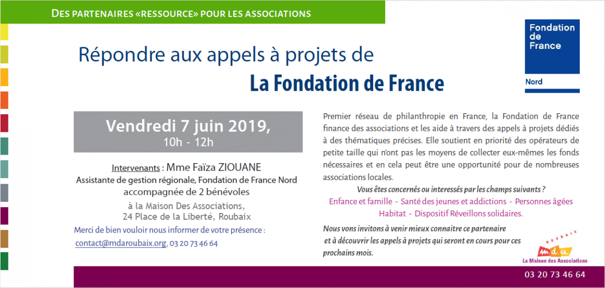 A cette occasion plusieurs représentants de la Fondation de France viendront vous présenter une sélection d'appels à projets qu'elle propose jusque fin 2019.