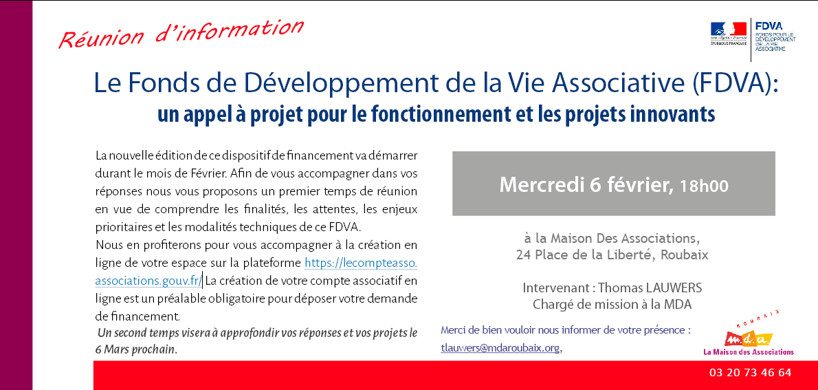 Afin de vous accompagner dans vos réponses nous vous proposons un premier temps de réunion en vue de comprendre les finalités, les attentes, les enjeux prioritaires et les modalités techniques de ce Fonds de Développement de la Vie Associative.