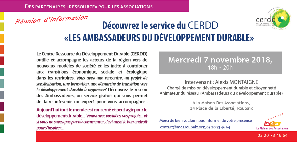 Connaissez-vous le réseau des ambassadeurs du développement durable? si votre association a envie de sensibiliser son public, de mener des actions concretes ou des temps de réflexion, quelque soit votre secteur d'acivité... le Cerdd peut vous apporter des ressouces bien utiles...