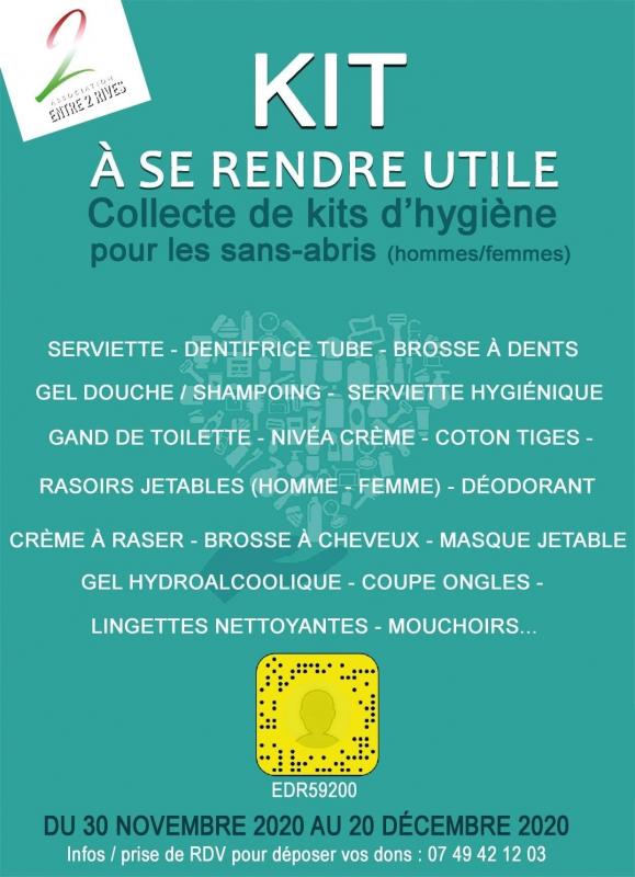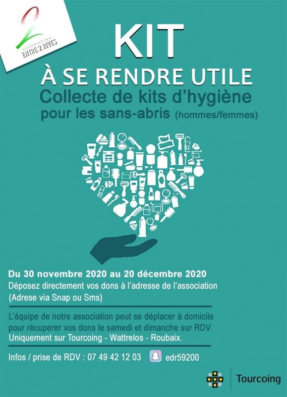 "Collecte de kits d'hygiène pour les sans abris: dentifrice, serviette, gants de toilette.... pour hommes et femmes du 30 novembre 2020 au 20 décembre 2020.