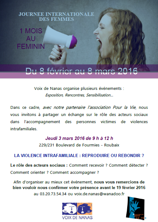 Dans ce cadre et en partenariat avec l'association Pour la Vie, nous vous invitons à participer le jeudi 3 mars 2016 de 9 h à 12 h à un échange sur le rôle des acteurs sociaux dans l'accompagnement des personnes victimes de violences intrafamiliales.