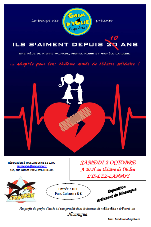 La troupe de théâtre « Grim D’Folie » n’a pas perdu de temps. Trop contente de retrouver les planches, elle nous offre un nouveau spectacle, celui de Pierre Palmade, Muriel Robin et Michèle Laroque « Ils s’aiment depuis 20 ans (enfin, 10 ans !) » au profit de notre projet d’accès à l’eau potable à Potosí au Nicaragua.