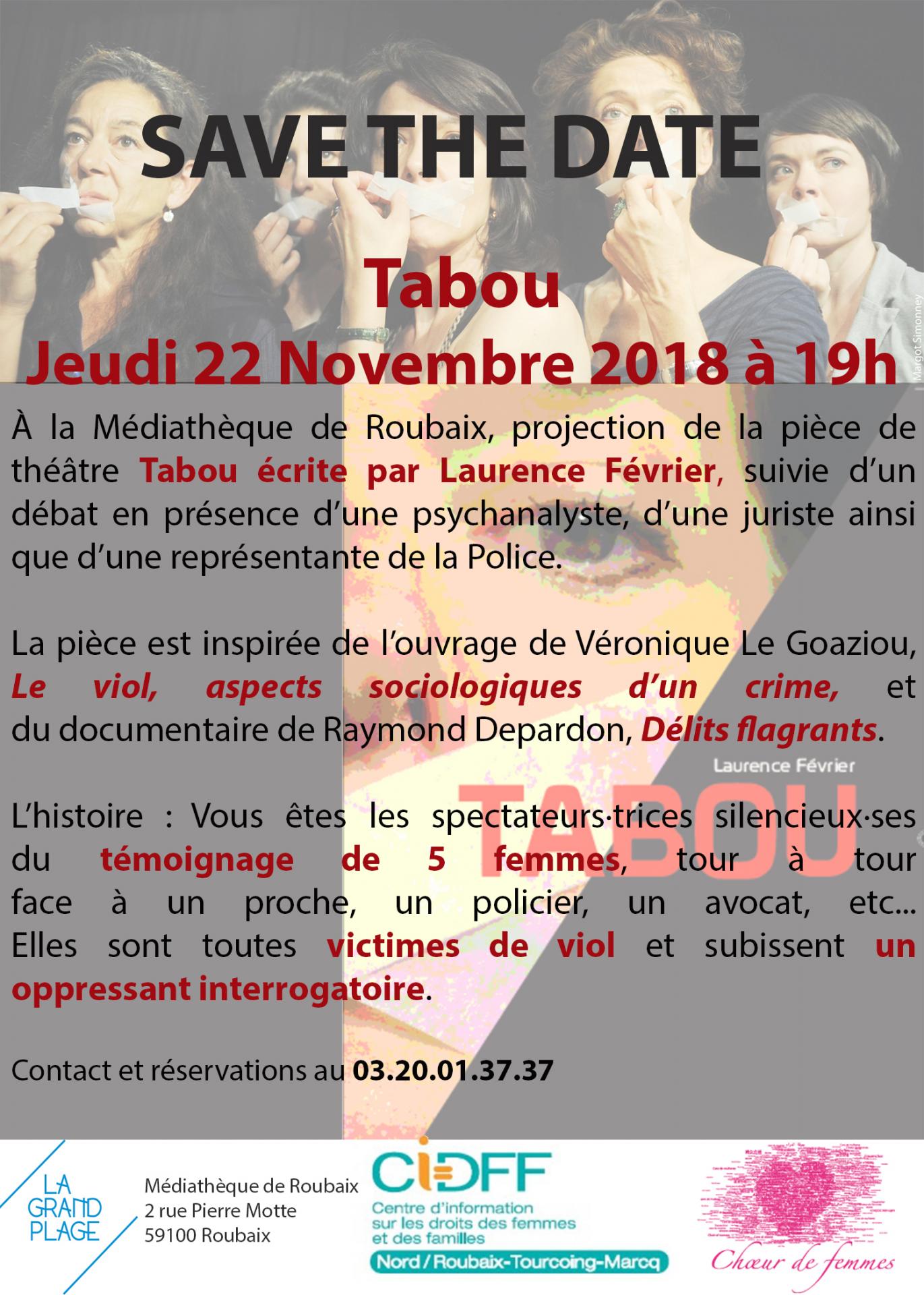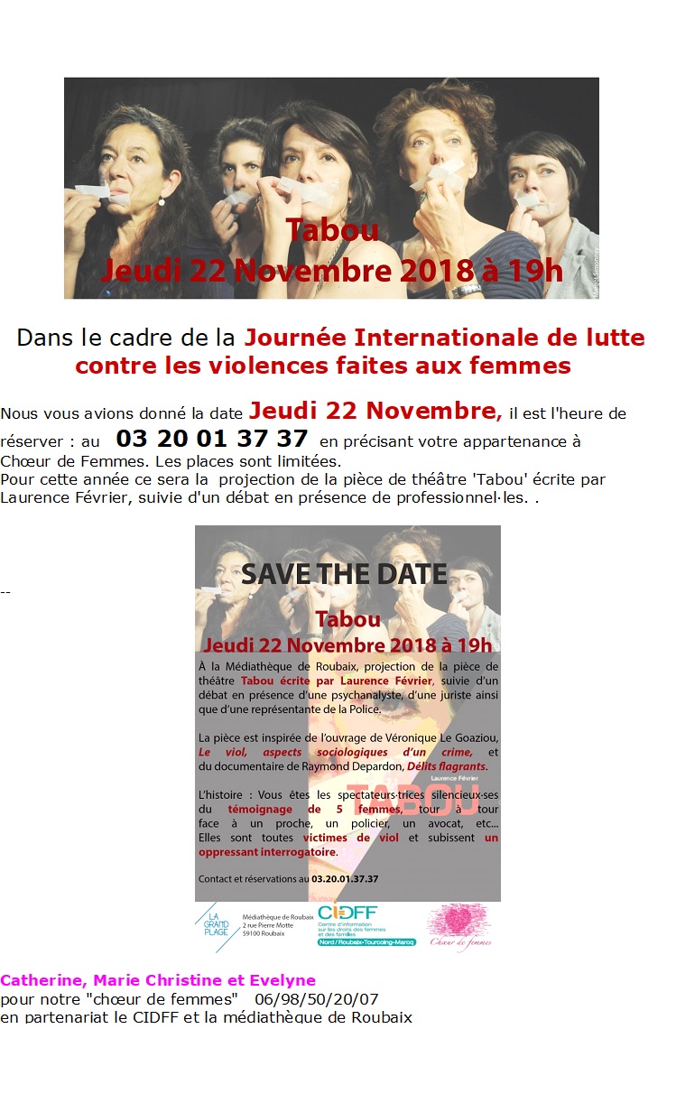 L'Ass. Choeur de femmes , le Cidff Nord Roubaix, vous invitent à vous inscrire pour ce temps de théâtre et de débat autour de la lutte contre les violences faites aux femmes :