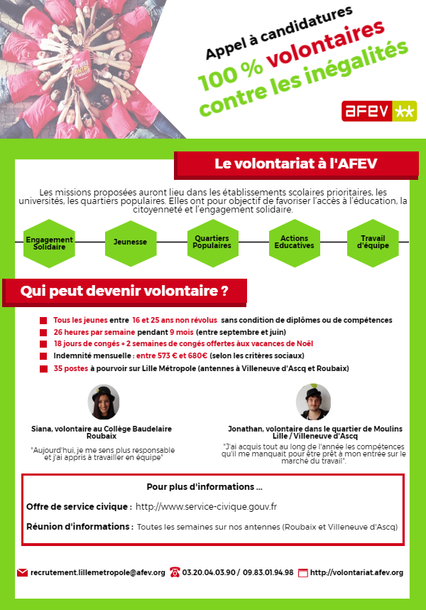 L'AFEV Lille métropole recherche 35 jeunes âgés de 16 à 25 ans, pour effectuer des missions sur Roubaix, Lille et Villeneuve d'Ascq.