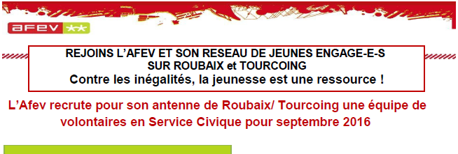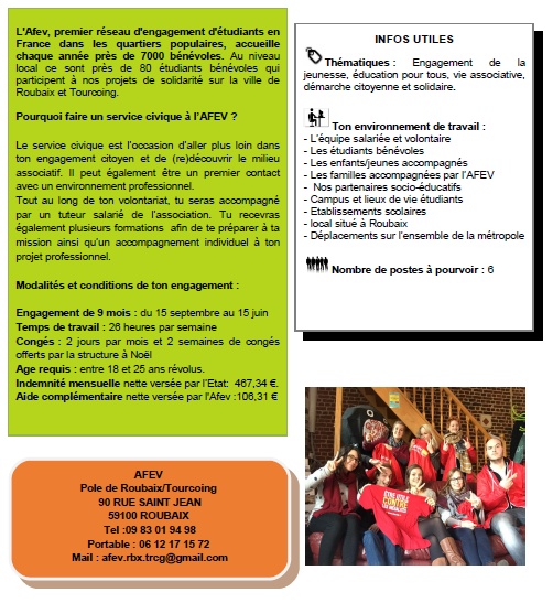 L'AFEV mets en place plusieurs réunions d'informations à ce sujet dans notre local au 90 de la rue Saint Jean à Roubaix :