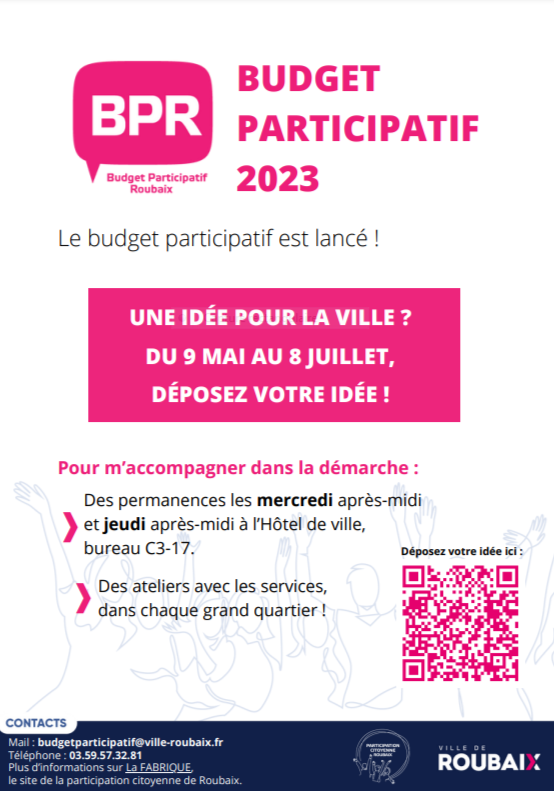 • Pour être accompagné dans le dépôt d’une idée, contactez-nous au 03 59 57 32 81 ou au 07 88 95 77 00 ou par mail : budgetparticipatif@ville-roubaix.fr