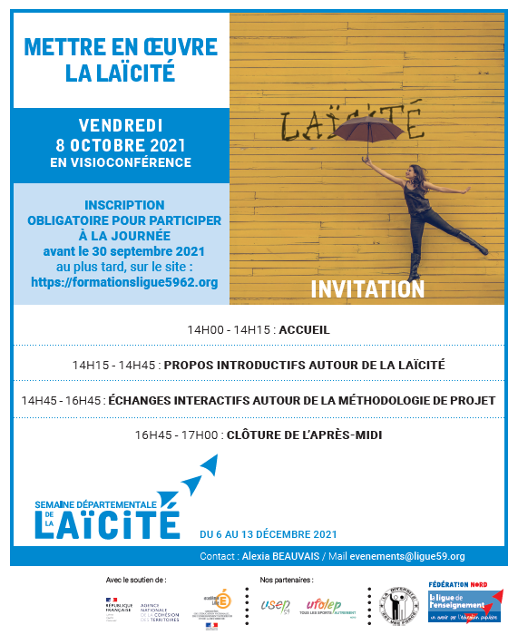 Un temps "Mettre en œuvre" est programmé le 8 octobre (Accompagnement à la réflexion sur la laïcité + Méthodologie de projet). Les personnes intéressées peuvent directement s'inscrire via le site de formation : www.formationligue5962.org avant le 30 septembre